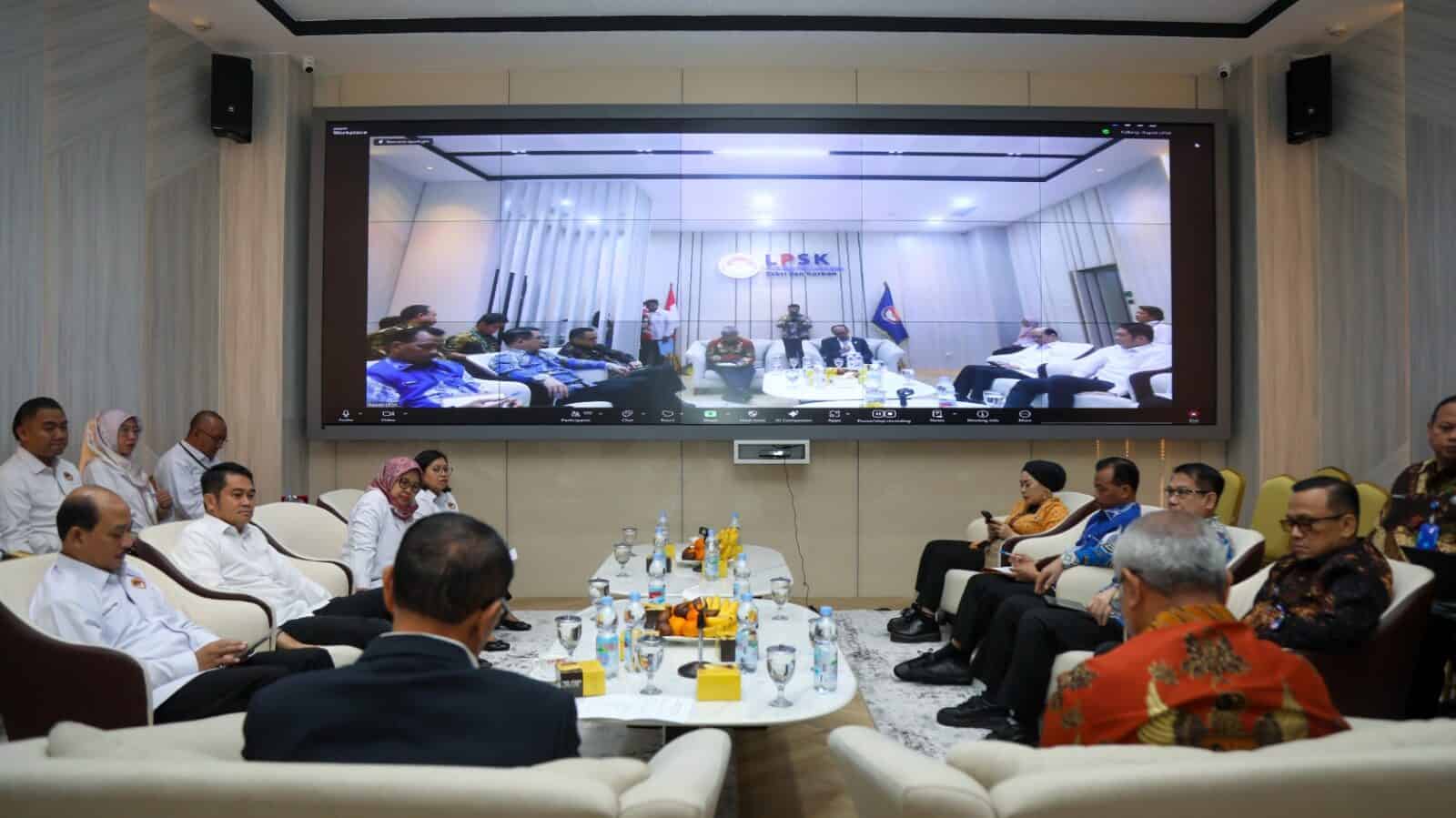 Kepala Badan Narkotika Nasional Republik Indonesia (BNN RI), Marthinus Hukom, melakukan audiensi dengan Ketua Lembaga Perlindungan Saksi dan Korban (LPSK), Dr. Achmadi, di Kantor LPSK, Jakarta Timur, pada Kamis (15/5). Audiensi yang dilakukan guna memperkuat sinergi dalam upaya pemberantasan narkotika ini juga diikuti oleh BNN Provinsi dan BNN Kabupaten/Kota dari seluruh wilayah Indonesia secara daring.